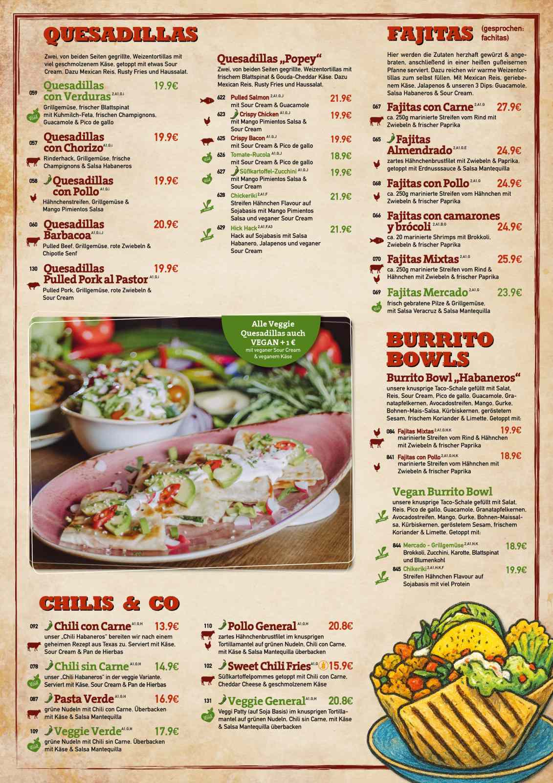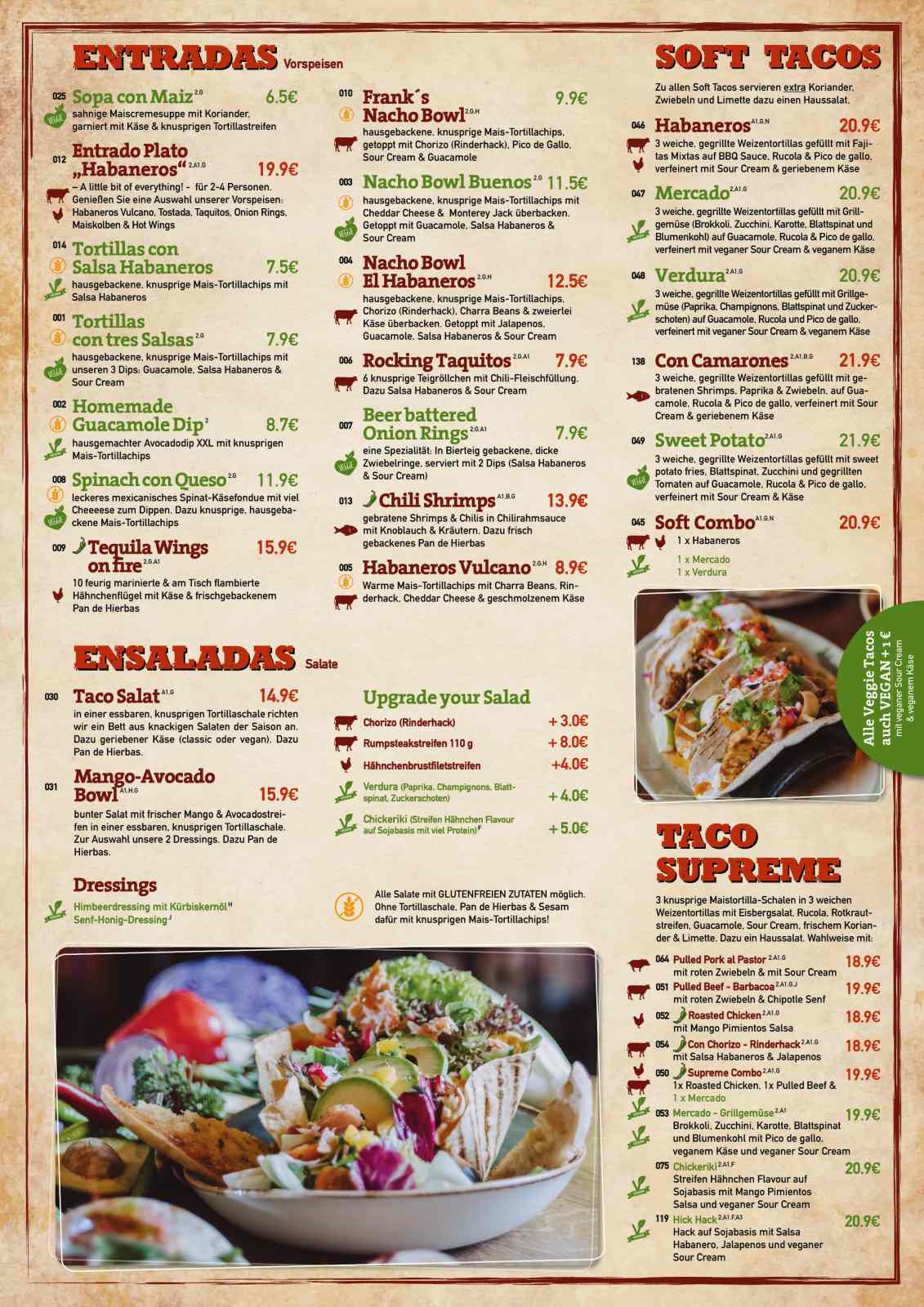 Mexikanische Klassiker, wie Tacos, Burritos, Fajitas oder Quesadillas bringen das Flair Mexikos direkt auf den Teller. Auch saftige Rindersteaks und knackige Salate laden in einer unvergleichlichen Atmosphäre zum Schlemmen ein. Dabei werden alle Speisen frisch und nach traditionellen Rezepten zubereitet – im Habaneros Würzburg könnt ihr Mexiko mit allen Sinnen erleben!